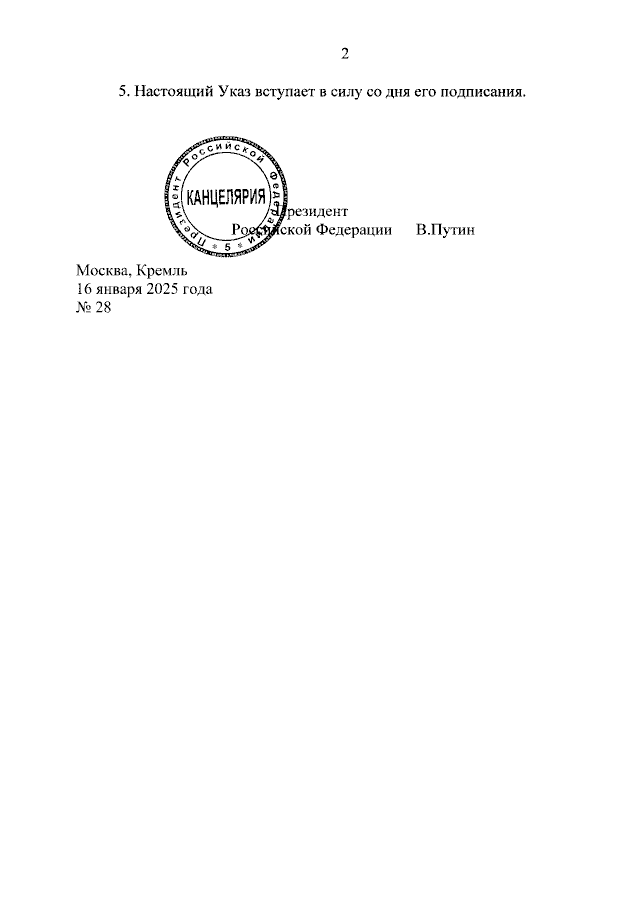 Указ Президента РФ от 16.01.2025 N 28 "О проведении в Российской Федерации Года защитника Отечества"