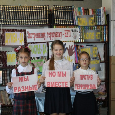 2 сентября в Бутурлиновской детской библиотеке прошла акция «Экстремизму, терроризму –НЕТ!», приуроченная к одной из самых трагических дат в российском календаре – Дню солидарности в борьбе с терроризмом. В этот день посетители библиотеки прослушали беседу о трагических событиях в Беслане, Москве, Волгограде и других городах, где от рук террористов погибли дети и мирные жители. В акции приняли участие учащиеся 4 кл. Бутурлиновской ООШ №7 (классный руководитель Сушкова Т.П.)