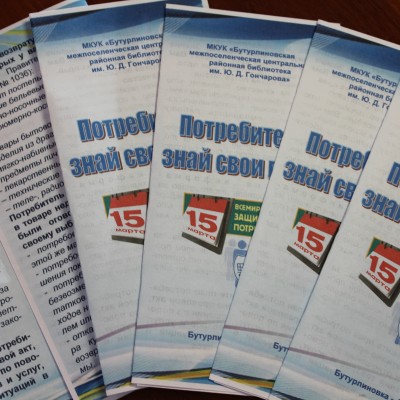 Ежегодно 15 марта отмечается Всемирный день защиты прав потребителей, в рамках которого отдел правовой информации районной библиотеки традиционно провел информационную акцию. Выпущены «Памятки потребителя» с информацией о том, куда обратиться потребителю, столкнувшемуся с нарушением своих прав, как потребителю отстоять свои права в различных ситуациях. Памятки и листовки с адресами и телефонами организаций по защите прав потребителей в Воронежском регионе, рекомендации Роспотребнадзора о действиях граждан в случае нарушения их прав покупателей раздавались в день защиты прав потребителей.