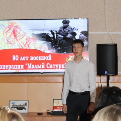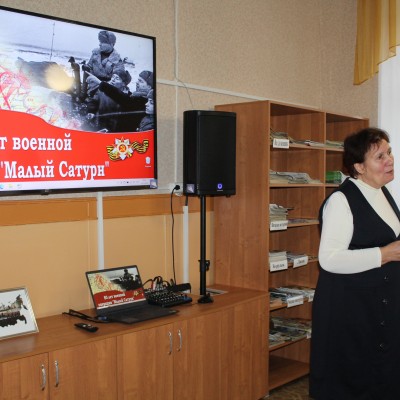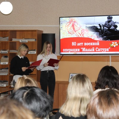 В рамках программы к 80-летию Среднедонской наступательной операции «Малый Сатурн» в центральной районной библиотеке для студентов Бутурлиновского филиала Губернского педагогического колледжа проведен урок истории, на котором рассказали о значении Среднедонской наступательной операции «Малый Сатурн» в разгроме немецко-фашистских захватчиков в ходе Сталинградской битвы. Это первое крупное и успешное наступление Советских войск на Воронежской земле в ходе Великой Отечественной войны, и знание этих героических страниц истории необходимо для молодого поколения.