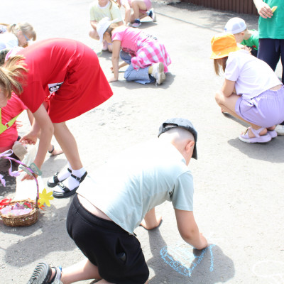 Дети, вооружившись цветными мелками, превратили серый асфальт возле библиотеки в яркую праздничную поляну. Юные художники проявили свою фантазию и нарисовали: эмблему праздника, любимых животных, героев книг, цветочные поляны….