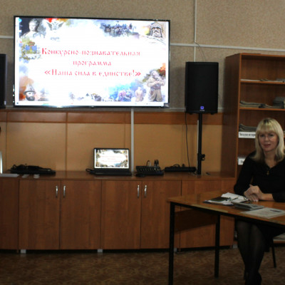 7 декабря в Бутурлиновской районной библиотеке для студентов Бутурлиновского филиала «Губернского педагогического колледжа» состоялась конкурсно-познавательная программа «Наша сила в единстве», организованная Бутурлиновским Домом Дружбы. Студенты окунулись в мир истории, узнали о традициях и обычаях народов России. Участникам команд были предложены конкурсы: «Литературные герои имеют право», «Их подвиг жив, неповторим и вечен», «Великие люди России», «Колесо истории» и другие.