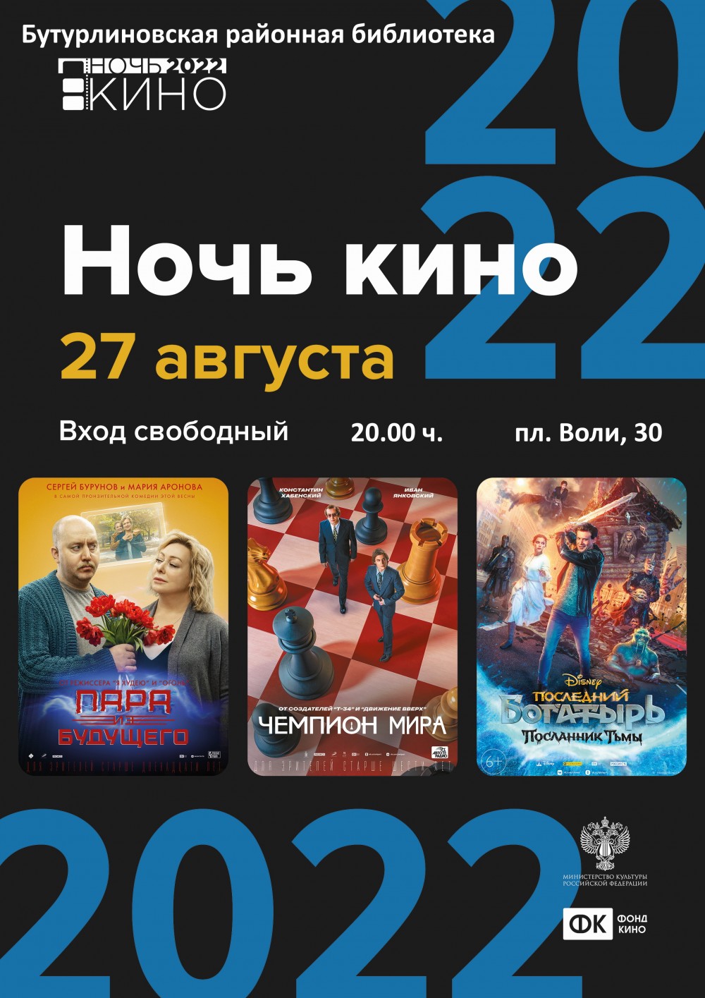 Бутурлиновская районная библиотека приглашает всех желающих принять участие во Всероссийской акции "Ночь кино 2022". Ждем вас 27 августа по адресу: пл. Воли, 30. Начало : 20.00 ч. Вход свободный.