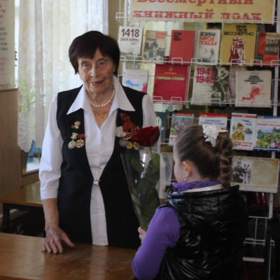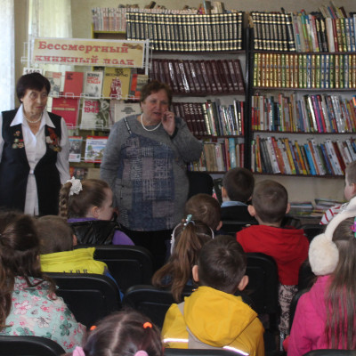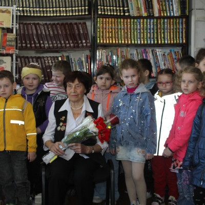 Детская библиотека присоединилась к областной патриотической акции «Твой ровесник на войне». Дети детского сада №5 встретились с представителем поколения «Дети войны». Жерегеля Вера Михайловна поделилась воспоминаниями о своем военном детстве. Она рассказала ребятам о том, что пришлось ей пережить в те годы, какие лишения и трудности выпали на долю её семьи: «Тяжело вспоминать о том, как во время бомбежек прятались в погребах, каким великим лакомством казался простой кусочек хлеба». Ребята слушали, затаив дыхание.