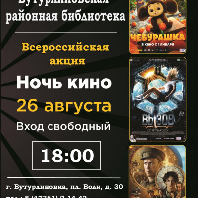Бутурлиновская районная библиотека приглашает всех желающих принять участие во Всероссийской акции "Ночь кино 2023". Ждем вас 26 августа по адресу: пл. Воли, 30. Начало : 18:00 ч. Вход свободный.