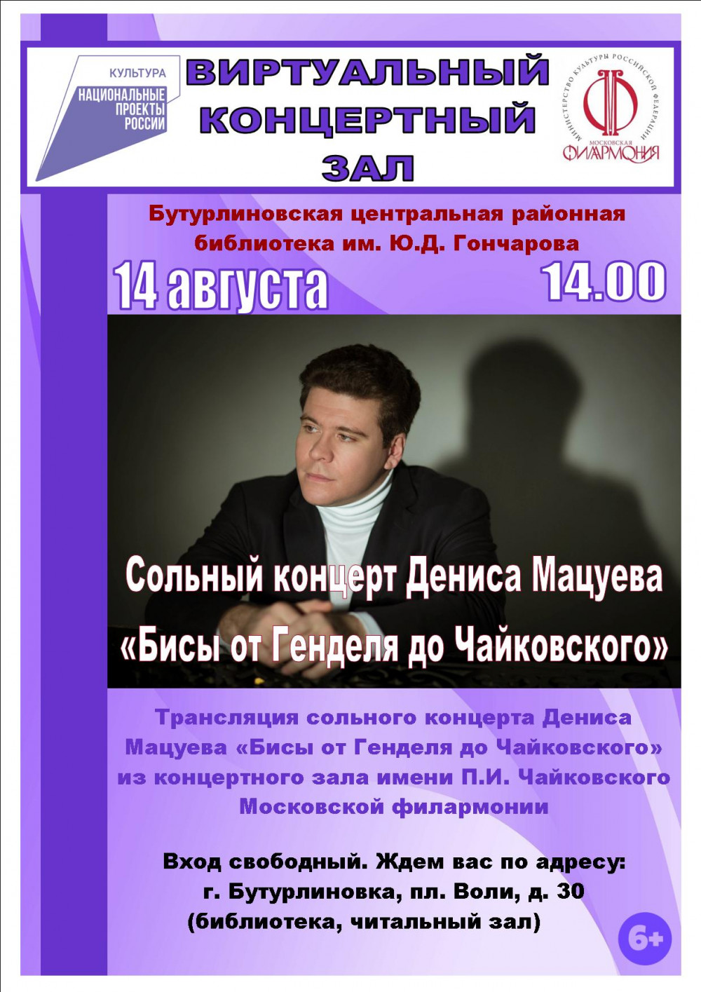 14 августа в виртуальном концертном зале Бутурлиновской районной библиотеки, действующем в рамках нацпроекта «Семья», состоится трансляция сольного выступления Дениса Мацуева «Бисы от Генделя до Чайковского» из концертного зала имени П.И. Чайковского Московской филармонии.